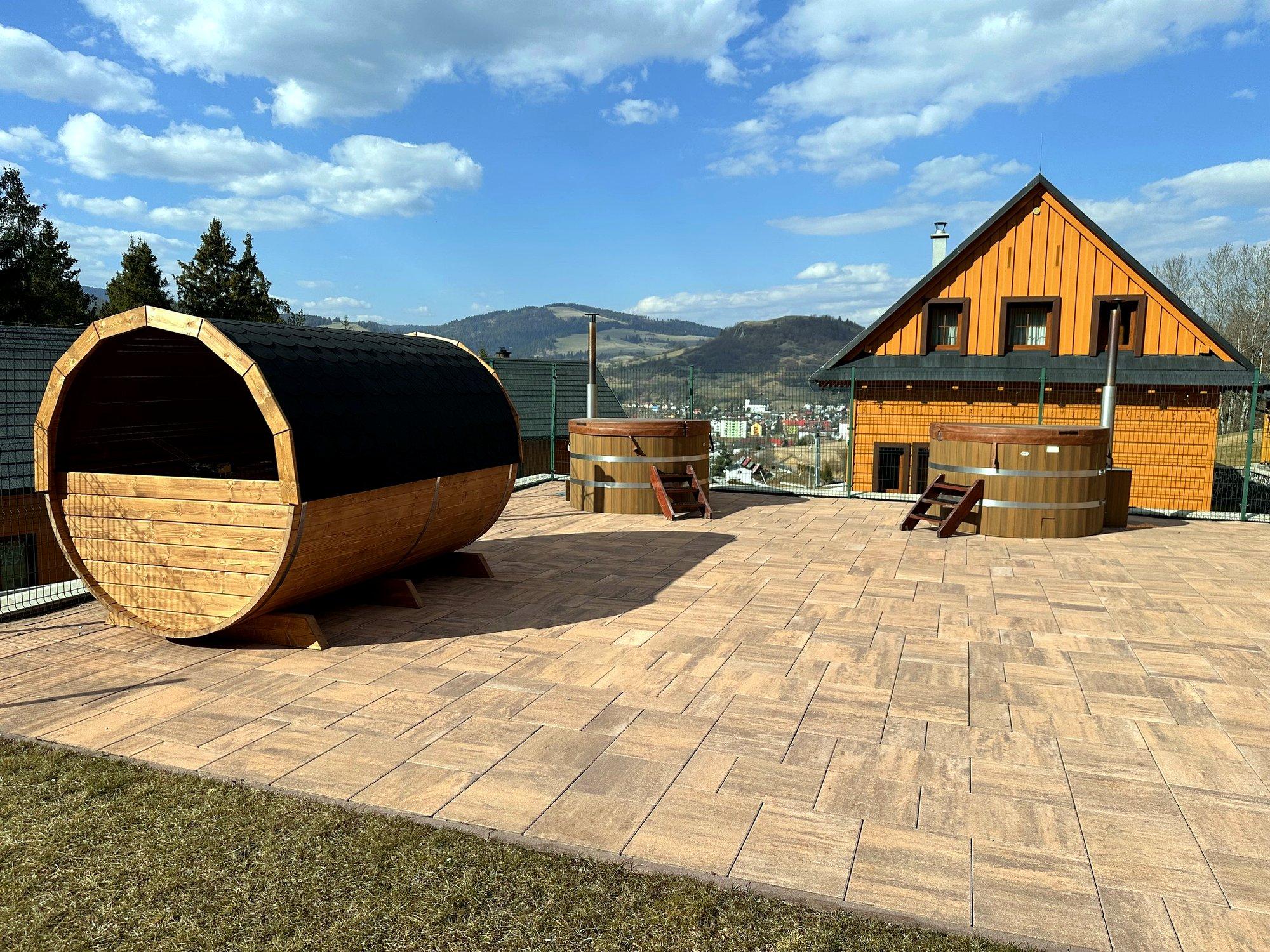 Áno. Kúpacie kade (2 ks) aj vonkajšia sauna sú k dispozícii za 50 € / deň.